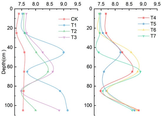 The pH of the surface soil in CK, with a depth of 0–30 cm, is significantly lower than or approximate to the soil pH of the sandwich profile as shown in Figure 3. Due to the complete soil structure, the pH of CK does not emerge, fluctuate, or change at different depths as the pH of reclaimed plots. Besides, the pH of layer H1 in reclaimed plots ranges from 7.43 (T6) to 7.67 (T3), and the pH of the interlayered soil (60–70 cm or 80–90 cm) is slightly higher than pH of the surface soil.