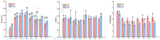 EC, SM, and SOM in the surface soil of T1, T2, and T3 show a tendency: as the depth of the interlayered soil increases, the EC increases, while SM and SOM decrease as shown in Figure 4. The thicker interlayered soil of T4, T5, or surface soil of T6, T7 makes EC, SM, and SOM of soil superior to the first three (T1, T2, and T3) types of reclaimed plot. Given layer H1, T3 and T7 possess EC of 102.00 us/cm and 78.00 us/cm, respectively, with 1.62 and 1.24 times as much as EC in CK, T3 contains the least SOM (4.76 g/kg) and T7 contains the highest (5.52 g/kg) in reclaimed plots, account for 76% and 88% of SOM in CK. SM exhibits a slight difference over all plots varying from 24.48% (T3) to 25.43% (T5). Compared to H1, EC and SM in H2 increase in some extent with a maximum increase ratio of 19.57% of EC of CK and 5.97% of SM of T4 over all plots, and SOM demonstrates a decreasing tendency on the contrary.