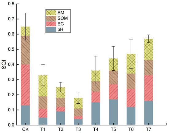 We calculated the scores of each index and sum the weighted scores of each variable to obtain the SQI value of each plot (Figure 5). The H1 SQI value of CK was 0.66. Among seven kinds of soil profiles with CG filling, the H1 SQI value of T7 was the highest at 0.57, while the T3 was the lowest at 0.18. The SQI value of CK is significantly higher than that of the reclaimed land. Figure 5 shows the SQI value of reclaimed plots in different profiles and the specific score of each index, which explicitly reflects the impact of the weighting factor obtained through PCA.