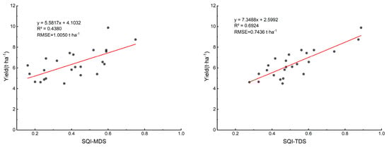 Add all soil properties into the total data system (TDS) to calculate the SQI, achieving better linear fitting with annual crop yield than SQI-MDS with yield. Determination coefficient (R2) and root mean square error (RMSE) are used to depict the fitting effect, as shown in Figure 6. Although the four selected soil indicators can reflect the changing trend of soil quality in different CG filling and reclamation profiles, the addition of the remaining soil indicators can still improve the prediction accuracy of SQI value for crop yields with higher R2 (0.6490) and lower RMSE (0.7443 t/ha).