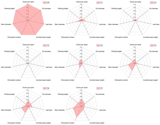 The seven measured data of maize agronomic traits are normalized. As shown in Figure 7, the radar map area of CK and reclaimed plots are in the same sequence as the SQI value, the maize growth of T7 comparatively exceeds among the reclaimed lands, and maize in T3 grows worst. Specifically, maize in T2 has the worst hundred-seed weight and chlorophyll content, maize in T3 has poor grains per spike, dry biomass, stem thickness, and plant height, maize in T4 has the worst performance in leaf area, while maize in T7 is superior in all traits compared with the rest of reclaimed plots. In terms of maize yield components, the average number of grains per spike of maize in CK and reclaimed lands is 559 and 446 respectively, while maize in the T7 plot has the highest number of grains per spike of 490. The average hundred-seed weight of maize in the CK is 26.08 g, which is significantly larger than the average hundred-seed weight of maize in the reclaimed lands (22.60 g) with the largest hundred-seed weight in T7 of 23.23 g.