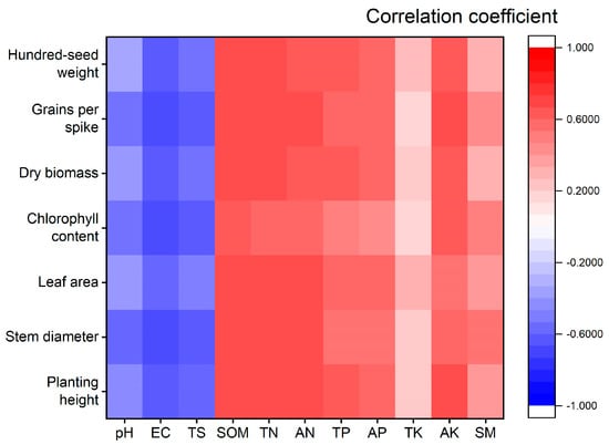 As shown in Figure 8, all agronomic traits, corn hundred-seed weight, grains per spike, aboveground dry biomass, leaf chlorophyll content, leaf area, stem diameter, and plant height, are positively correlated with nutrients and SM, correlation between stem thickness and AN is maximum with a coefficient of 0.986. All traits are extremely significantly correlated with SOM, TN, AN, and AK, while the correlation with TK is relatively lower than 0.4. All traits are negatively correlated with pH, EC, and TS, the minimum correlation coefficient is −0.979 calculated by grains per spike and EC. The positive correlation between nutrients and growth situation indicates that the increased availability of nutrients has a beneficial effect on maize plants, thus promoting the growth, yield, and yield components of crops, similarly, negative correlation indicates the inhibitory effect on plant growth. Therefore, higher nutrient levels and lower pH, EC, and TS levels of soil in T7 result in a high growth and yield of maize and vice versa for T3. On account of the correlation between plants and soil properties, the level of soil quality can still be differentiated even from the perspective of crop growth. Determining the influencing factors of maize growth can increase maize yields by upgrading soil quality in a targeted manner, for example, by limiting TS and increasing SOM, TN, AN, and AK in topsoil to ameliorate soil properties.