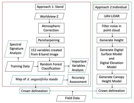 In this study, we compare two approaches for detecting, mapping and delineating A. angustifolia at different scales—the stand and the individual tree level. Our approach integrates multispectral and object-based classification in a machine learning environment to delineate A. angustifolia stands from Worldview-2 images, UAV-based Light Detection and Ranging (LiDAR) and field data to improve validation and to assess our ability to accurately map A. angustifolia. Our research questions were as follows: