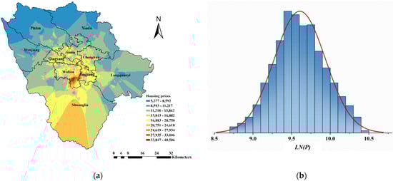 Study area and housing price distribution. (a) the spatial distribution of housing prices; (b) the normal distribution of logarithm of house prices.