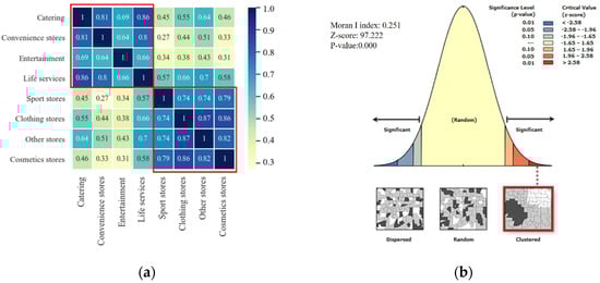 Pearson coefficients and Moran I Index of UR. (a) represents the Pearson correlation coefficient among different urban retail types; (b) represents the Moran I index of urban retail.