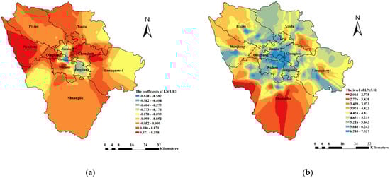 To further examine the influence of spatial heterogeneity, we employ the Kriging method (Figure 3a) to perform spatial interpolation on the coefficients of LN(UR). Negative coefficients were observed in the core area of Chengdu, with Tianfu Square as the center, while positive coefficients were observed in the peripheral area of Chengdu, particularly in Wenjiang and Pixian districts, which are in the northwest area of Chengdu. In general, the coefficients of LN(UR) show significant spatial heterogeneity and reflect a nearly circular distribution, which gradually increases outward from the city center (from −0.8097 to 0.2009). In other words, residents in the periphery area need an increased UR intensity to realize convenience from UR, and residents in the core area reject the increase in UR intensity to protect their habitable environment and life equality.