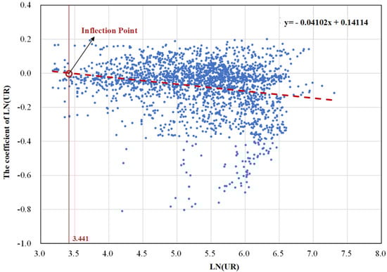 Furthermore, we plot the spatial distribution of LN(UR) (Figure 3b) and assign a reverse color direction (the blue part indicates higher ownership LN(UR)) for ease of comparison with Figure 3a. We find that the LN(UR) coefficients have a similar spatial distribution to LN(UR). Hence, we assume that the regression coefficient of LN(UR) is related to the level of LN(UR). This hypothesis is supported by the scatter diagram (Figure 4) between the LN(UR) and coefficients of LN(UR). Figure 4 shows that LN(UR) has a negative impact on the regression coefficients of LN(UR), which implies that the positive capitalization effect of LN(UR) on housing prices gradually decreases with the increase in the level of LN(UR). The fitting straight line indicates that the impact of average LN(UR) on housing prices shifts from promotion to inhibition when average LN(UR) reaches 3.441, where the attitude of residents changes from demand to resistance. This shows that there is an inverted U-shaped relationship between LN(UR) and housing prices. To directly confirm this deduction, we established a new hedonic price model, which introduced the square of LN(UR). The result is shown in Table A1. From Table A1, we can see that the regression coefficients of the square of LN(UR) was −0.015 at the 5% significance level, confirming the inverted U-shaped relationship between LN(UR) and housing prices. Generally, before LN(UR) reaches the inflection point, LN(UR) has a positive capitalization effect on housing prices, which decreases with the increase of LN(UR). After reaching the inflection point, the positive capitalization effect changes to a negative effect on housing prices. This might be due to two reasons: (1) with the increase in UR, the demand for the convenience of UR eventually plateaus, which leads to a reduction in the willingness to pay for the increase of UR convenience and (2) the increase in UR will attract more consumers and negatively affect the comfort of the living environment [10,13].