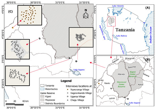 The four districts around the MKGR that are mainly affecting the reserve through illegal grazing. Locations of interviews taken in 2019 at the four different villages shown (Chagu in Uvinza district, Ugansa in Kaliua district, Kagerankanda in Kasulu district and Nyaruranga in Kibondo districts; N = 159). (A) The map of Tanzania displaying the Moyowosi Kigosi Game Reserve (MKGR) in the Western (B) The mapa of MKGR displaying the four districts where interview took place, i.e., Uvinza, Kaliua, Kasulu and Kibondo districts (C) The four villages where interviews were taken (Chagu in Uvinza district, Ugansa in Kaliua district, Kagerankanda in Kasulu district and Nyaruranga in Kibondo districts).