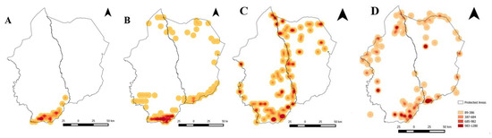 Spatio-temporal patterns of incidents of illegal grazing in Moyowosi-Kigosi Game Reserve between the years 1990 and 2019. (A) Spatio-temporal pattern of illegal grazing in the years 1990–1998, (B) for the years 2000–2003, (C) for the years 2006–2014 and (D) for the years 2017–2019. (A–C) Spatial data from the survey report and (D) spatial data from the rangers’ report. The colours of circles represent the number of livestock individuals per herd.