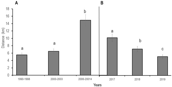 Average (±SE) distances from the reserve boundary into the reserve of locations where illegal livestock intrusion was encountered. Distances are shown as km away from the boundary of Moyowosi—Kigosi Game Reserve (MKGR) into the reserve (A) for the years 1990–1998, 2000–2003 and 2006–2014 for survey data and (B) for the years 2017, 2018 and 2019 based on ranger report data. Different small letters denote statistically significant differences across year categories by Gomes Howell test at p = 0.05.