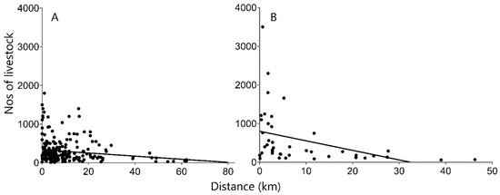 Both survey data (Figure 4A) and ranger report data (Figure 4B) showed that the individual livestock numbers per herd significantly but slightly declined as the distance into the MKGR increased (R = −0.20, p = 0.020; Figure 4A; R = −0.40, p = 0.010; Figure 4B).