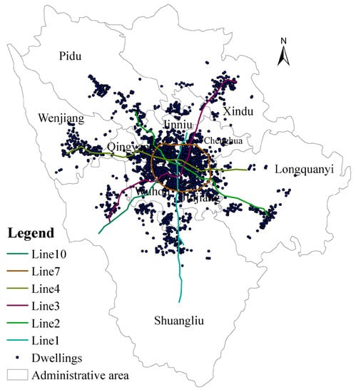 The data are taken from the website Lianjia, the Gaode Map, and the GIS platform. The study used a residential house as the basic unit of analysis, located in the residential areas of each district covered by the subway network. This article used housing-related data obtained through the network crawler extracted from lianjia.com, a leading website and heavy vertical real estate service platform in China that integrates real estate information searches, product research and development, and big data processing and service standards. Many Chinese scholars use the data from this website to illustrate its usefulness for research [30,31]. However, considering that the impact of rail transit on single-family houses, villas, and commercial houses are different, the collected data set excludes samples of single-family houses and villas. At the same time, the new house information of this website lacks a series of structure attribute information, and the new housing prices are easily affected by macroscopic policy. Therefore, the data collected in this research are limited to secondhand house-related information. This paper will only consider the secondhand commercial houses with seven or more floors to rule out the influence of elevators on house prices. This paper obtained a data set of valid housing information from a total of 22,507 residents after eliminating the missing samples of related attributes and other samples that did not meet the research requirements. The data obtained in this paper are cross-section data until 20 December 2019, so in the subsequent opening of Line 5, Line 10 phase II and the tram Rong 2 line are not in the scope of this study. Figure 1 shows the distribution of the housing sample in relation to the location of the subway.