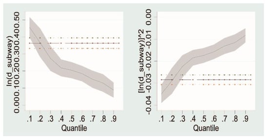 The results of quantile regression are similar to those of least squares regression. The results of Equation (8) quantile regression show that the coefficients of d1–d6 show a consistent trend, and that the values of d1–d6 increase first, then decrease. In Equation (9), the sign of the regression coefficient of each quantile is the same as that of the least squares regression, which indicates that the relationship between housing price and the distance from housing to the subway station is in an inverted U shape, further showing that the impact of rail transit on housing prices is a combination of positive and negative factors.