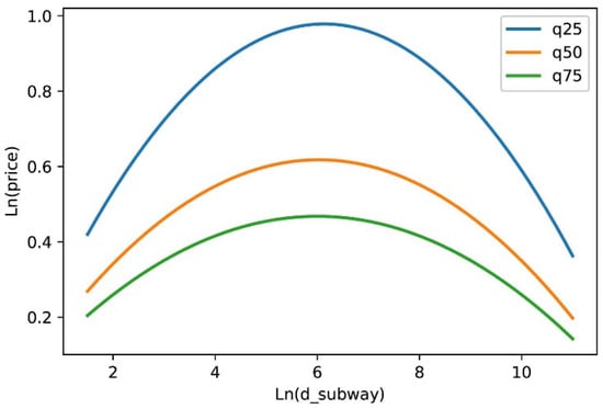 In addition, the proximity of the subway has a greater impact degree on low- and medium-price housing. For the same distance range in rail transit, the impact of subway station accessibility on housing prices is not the same degree. For example, if a house is 250–500 m away from a subway station, the coefficients of the 25th, 50th, and 75th percentiles are 0.092, 0.081, and 0.056, respectively, and they decrease in order, which means that, at the same distance from a subway station, rail transit accessibility has less impact on low- and medium-price housing. Equation (9) further supports this conclusion, which shows the functional relationship between housing price and distance from housing to subway station at each quantile when controlling other variables (as shown in Figure 4). As the distance increases, the slope of the rise and fall of house prices in the 25th percentile is the largest, followed by the 50th percentile and the 75th percentile, meaning that the low- and medium-housing prices change more rapidly as the distance from the subway station increases. This shows that low-cost housing is more sensitive to the impact of subway station proximity and subway station proximity to the impact of low-cost housing than high-cost housing.
