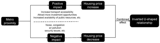 Taking the subway system of Chengdu as an example, this paper analyzed the impact mechanism of rail transit on housing price through hedonic price model based on OLS, and then in order to explore the heterogeneous influence of rail transit on housing price with different prices, we adopted quantile regression to study the heterogeneity of urban rail transit on low-, medium-, and high-priced housing. When exploring the nonlinear impact of rail transit proximity on housing prices, we adopted two different strategies: to shift the distance between housing and subway station from continuous variable to virtual variable, and to introduce the square term of the distance from the housing to the subway station. The virtual variable processing of the distance, on the one hand, can directly compare the influence of rail transit proximity on the housing price in different distance segments, and, on the other hand, can help to judge the impact range of the subway according to the significance of the coefficient. On the basis of retaining the original continuous variable of ln(d_subway), a quadratic term is introduced into the model, whose results prove the nonlinear effect of rail transit proximity on house price once again, making the nonlinear impact mechanism more authentic. As the distance increases, the house price rises first, and once it exceeds a threshold, the house price will decrease as the distance to the subway station increases. Geng et al. (2015) also found this phenomenon when they studied the effect of a high-speed rail station on spatial variations in housing price [33]. In fact, the influence of subway proximity on housing price is the result of positive and negative influence factors. As Figure 5 shows, the noise, congestion, and safety problems of the subway system will reduce the price of houses within a short distance of a subway station [34], but these negative effects will decrease as the distance from the subway station increases. While the metro system has a positive impact on the accessibility of residential areas, the combined effect of the two will lead to a rise in housing prices. However, as the distance from the metro station continues to increase, the negative externalities disappear, but with the reduced accessibility and convenience of the metro, the positive premium of the positive impact will be reduced and house prices will continue to decrease.