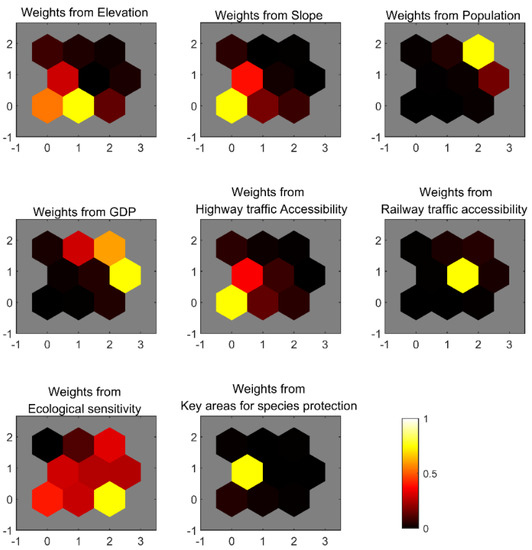 Rural type zoning is an attribute-weighted spatial clustering, and the Self-Organizing Map neural network approach can properly perform this task. Self-Organizing Map (SOM), also known as Kohonen’s network, is an unsupervised learning network that incorporates a large number of features that mimic the neuronal signal processing mechanism of the human brain [35,36]. By automatically searching for intrinsic patterns and essential properties in samples, this neural network optimizes the network parameters and structure in a self-organizing and adaptive manner and is widely used in the fields of clustering, data compression, feature extraction, and high-dimensional visualization [37].