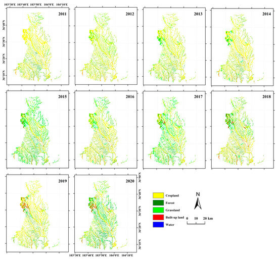 - Landsat Images. The main data source used in this study were Landsat images, which were all downloaded from the GEE platform [29]. The satellite images included Landsat TM (2011), Landsat ETM+ (2012), and Landsat OLI (2013–2020), in which the Landsat ETM+ images were repaired. We use GEE’s Filter series of functions to filter the images. The standard for image filtering is from January to December of each year, and the cloud cover is less than 10%. After cloud removal, mosaic, and clipping, the usable remote sensing images are generated. The specific data sources are shown in Table 1.