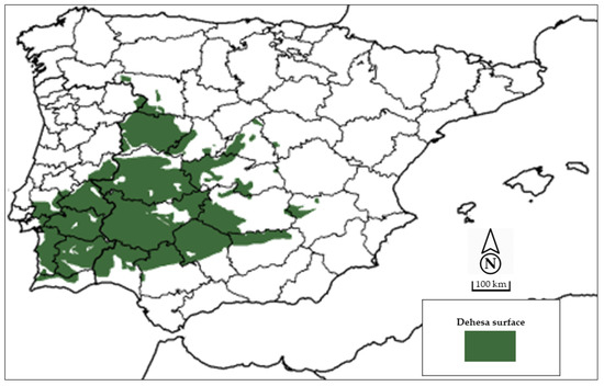 Distribution of dehesa in the Iberian Peninsula. Source: [55,56]. Authors own elaboration.