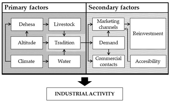 The Iberian pig transformation industries (hereinafter IPTIs) are located around the traditional production areas that produce international gourmet food, namely acorn-fed Iberian ham [58] 2. IPTIs are industries with specific production systems [45] and an important territorial base [59] whose origin and location are defined by the primary and secondary factors, as indicated in Figure 3 [60].
