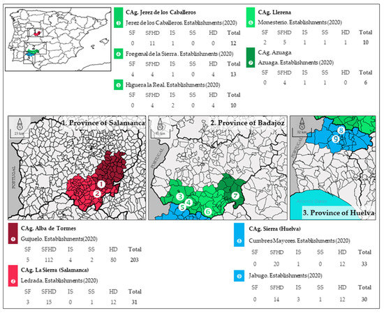 The information on products marketed by the municipality (2019) is obtained from the “Informative Registry of Independent Control Organisations of the Iberian Peninsula” [82] (esp. “Registro Informativo de Organismos Independientes de Control del Ibérico” (hereinafter RIBER), Ministry of Agriculture, Fisheries and Food).