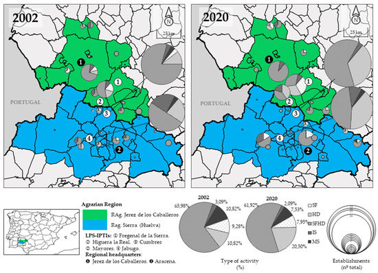 By type of activity (see Table 3), the highest growth occurred in all LSP-IPTIs in the HDs by 181.82%, with those in Cumbres Mayores standing out, as well as in Jabugo and Higuera la Real in absolute numbers. The number of SFs grew moderately by 33.33%, but only in Fregenal de la Sierra. The rest of the activities were reduced as a whole, especially the ISs by −30.00% and SSs by −50.00%, but the changes were only registered in Cumbres Mayores and Jabugo. SFHDs increased in Higuera la Real and Jabugo, and decreased in Cumbres Mayores and Fregenal de la Sierra, losing a moderate −6.67% overall. All types of activities existed only in Cumbres Mayores in 2002 while the SS activity changed in 2020, initially, the least diversified being Higuera la Real, consisting of SFHDs and ISs, and HDs incorporated only in 2020.