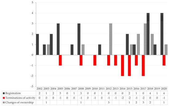 Registrations, terminations of activity, and changes of ownership per year (2002–2020). Source: [80,81,94]. Authors own elaboration.