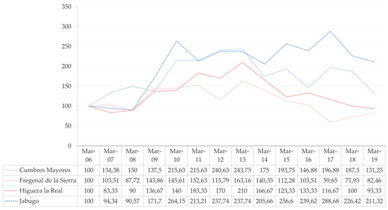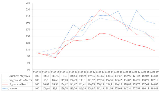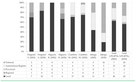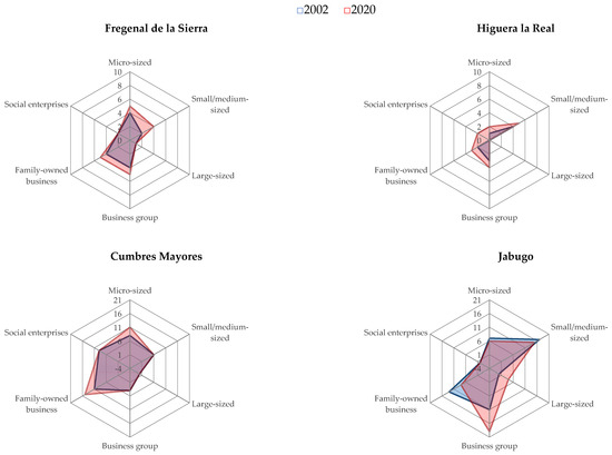 Compared among the four LPS-IPTIs, Cumbres Mayores and Jabugo were mostly noted for their important industrial activity for both years analysed in this study, as shown in Table 3. Although this concentration did not alter, between 2002 and 2020 the number of industrial establishments and companies increased in the four LSP-IPTIs. The growth of Higuera la Real stood out with 80.00% growth of the number of companies and 100.00% growth of the number of the establishments, while the rest grew moderately (see Table 3). The number of establishments, including secondary establishments, i.e., not in headquarters, increased greater in comparison with the number of the companies.