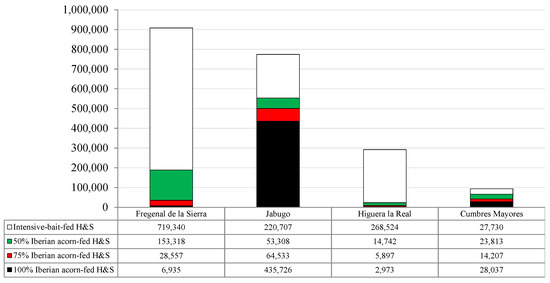 Through the RIBER, the marketed production of Iberian hams and shoulders (hereinafter H&S) is obtained in each of the LPS-IPTIs (2019). In total, 2,068,347 pieces of Iberian H&S were sold, consisting of 16.30% of the total Spanish production, as shown in Figure 9. Fregenal de la Sierra was the LPS-IPTI that sold the most, i.e., 43.91% of the total produced by the four LPS-IPTIs analysed in this study, followed by Jabugo (37.43%), Higuera la Real (14.27%) and Cumbres Mayores (4.39%). When analysing the qualities of the products marketed, the results changed substantially. Fregenal de la Sierra provided 79.21% (or 8.26% of the Spanish national market share) of mainly commercialised H&S of lower quality to the market, whereas Higuera la Real catered for 91.92% (or 0.76% and 1.02% H&S respectively) of 100% Iberian acorn-fed products of the maximum quality. On the contrary, Jabugo sold 56.28% of 100% Iberian acorn-fed H&S (45.90% of the Spanish national market share), with bait hams and shoulders falling to 28.51%. The most balanced sales in terms of quality were shown by Cumbres Mayores, that sold the highest volume of 29.89% of acorn-fed H&S that was 100% Iberian.