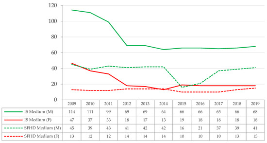 As shown in Figure 10, taking the variation of employment in two types of companies, namely small-sized SFHDs and medium-sized ISs, between 2009 8 and 2019, it is observed how the international economic crisis provoked a generalised fall in employment in large companies, with a similar trend both in terms of male and female employment. However, while the latter stagnated, male employment tended to grow. In 2019, male employment declined by −40.35%, whereas female employment declined by −61.70%. Overall, it can be observed that the medium-sized companies were more stable initially, which resulted in the decline of male employment only at the end of the crisis when male employment declined by −61.90% between 2014 and 2015, with a fluctuation between 2009 and 2019 of −8.88%, whereas female employment experienced somewhat greater stability (28.57% between 2014 and 2015), with a fluctuation of 15.38%.