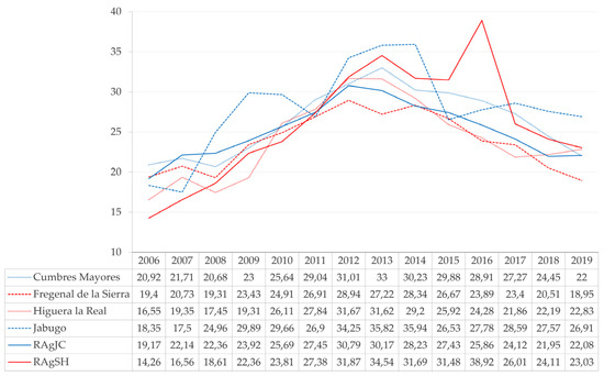 The evolution of the unemployment rate between 2006 and 2019, indicated in Figure 11, shows the consequences of the international economic crisis as of 2008, affecting Jabugo above the rest, which went from an unemployment rate of 17.50% in 2007 to 29.89% in 2009 and reached 35.94% in 2014, while the rest of the LPS-IPTIs followed the same trend. Jabugo also registered the latest recovery, remained unstable and did not reach pre-crisis values.