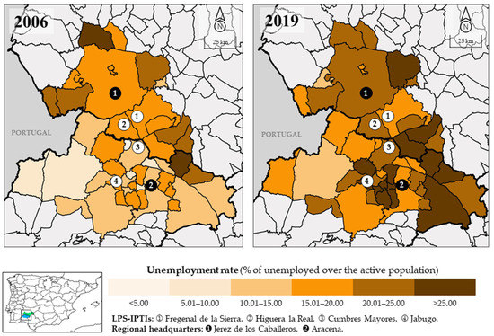 It is necessary to take into consideration the unemployment rate in the LPS-IPTI regions, indicated in Figure 11 and Figure 12, to comprehend its dimension as a whole and due to the generation of LES. In 2006, the unemployment rate was higher than its regional average in Cumbres Mayores and Jabugo, while in Fregenal de la Sierra and Higuera la Real the unemployment rate was below the regional average. The municipalities that were close by to the LPS-IPTI had similar unemployment rates. In 2019, unemployment exceeded the regional averages in Jabugo and Higuera la Real. Although unemployment rates remained high in all the municipalities of the region, Fregenal de la Sierra presented the best results in its region and the unemployment tended to decline in Cumbres Mayores.