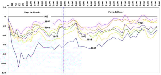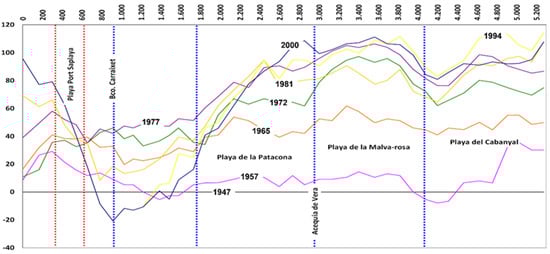 Research has been carried out [,] based on aerial photos, and determined the volumes of additions and losses of sediments on the coastline. Figure 6 shows the evolution of the coastline, calculated by photogrammetry, between the port of Saplaya and the port of Valencia. This shows the coastline to have expanded considerably between 1957 and 1965. In one 5 km stretch, a volume of 4,470,219 m3 eroded between 1947 and 2000, and there was an accumulation of 1,082,632 m3, so that it can be concluded that the transport capacity was approximately 64,000 m3/year.