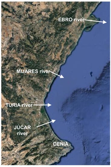 Results of the mineralogic analysis of the sediments in the Valencia Oval show that the most important contributing rivers are the Ebro, Mijares, Turia, and Júcar. Sediments from the Ebro reach the most southerly beaches in the Oval. The Mijares previously fed beaches to the north and presently the Turia and Júcar provide almost nothing, based on the results of the analysis of tourmaline, which is only present in the Ebro and Míjares. Some studies evaluated the volumes of sediments in dams and hydrographic basins [], giving details of the landslides in the Ebro Basin, along with the names of the dams, their initial capacities in hm3, the volume of the landslides in hm3, the year of the evaluation, and the dams’ percentage of lost volume. The average landslide volume was estimated to be 0.54 hm3/year.