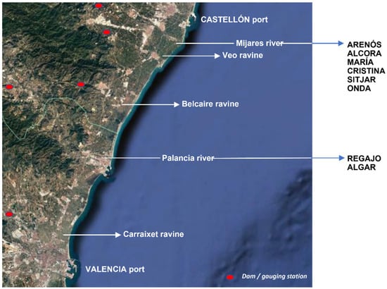 It can thus be seen that, according to the river flows and conditions, there is no large sediment transport capacity. There are also other problems that affect the transport of sediments from rivers, such as the overexploitation of aquifers, the maintenance of riverbanks, and the presence of dams. The construction of a dam to store water means it will also store sediments that will never reach the river mouth and thus cannot provide them to the coast. Figure 9 shows dams with their gauging stations to the north of Valencia’s port in the Valencia morpho-dynamic unit.