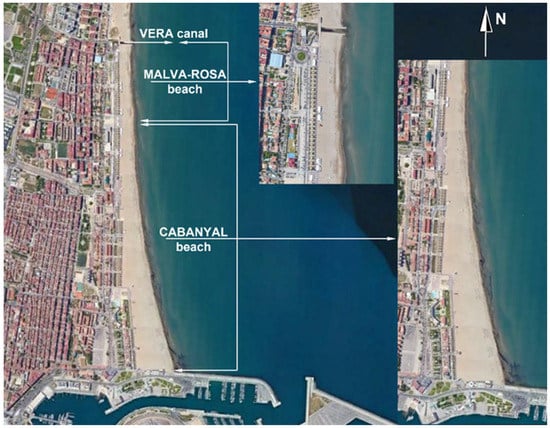 The beaches to the north of Valencia have different types of patterns due to the barrier effect of the port on the coastline, in which the sediment is transported towards the south. The beaches of Malva-rosa and Cabanyal in the north (Figure 10) form a coastal front with no continental contribution and receive sediments from the north–south current. Malva-rosa is eroding, while Cabanyal clearly receives sediments, according to studies carried out between 2008 and 2015.