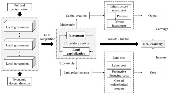 To understand the development of land capitalization in China, it is necessary to understand China’s special political and economic system []. Not only did the rise of land capitalization stem from this system, but the excessive development of land capitalization is also closely related to it. Figure 1 shows the analysis framework of this study.