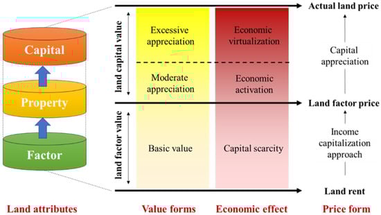 We drew on Capozza and Helsley [] and Rhee [] to propose a new quantitative measure of land capitalization based on the land value dichotomy. As shown in Figure 3, in the land value dichotomy, we divide the total land value into the land factor value and land capital value. The land factor value refers to the basic value of land as a factor of production and life. The land capital value refers to the part that exceeds the basic value caused by land appreciation after land is put into capital operation. A certain land capital value may be beneficial for revitalizing the economy, but if excessive speculation occurs, the land capital value will rise uncontrollably and lead to economic bubbles.