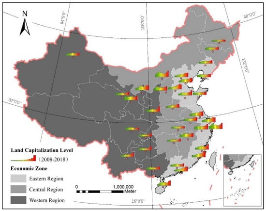 Table 1 shows the calculation results (2008–2018). The larger the numerical value, the higher the degree of land capitalization. Figure 4 shows the spatial visualization of the results, and the bar graph represents the degree of land capitalization. The results show that the degree of land capitalization in China has rapidly increased since 2008, with the average value increasing from 1.44 in 2008 to 3.31 in 2018, representing an increase of 130%. Eleven cities, including Beijing, had an average growth rate of 200%. Another set of 11 cities, including Shanghai, had an average growth rate of 100%. Thirteen cities, including Guangzhou, had an average growth rate below 100%. Because of regional differences in economic and social development, there are significant differences in the degrees of land capitalization in the eastern, central, and western regions. The order of the average degree of land capitalization from high to low is eastern (3.67), western (3.14), and central (2.86), and the order for the growth rate is eastern (160%), central (115%), and western (97%). The changing trends in land capitalization in the 35 cities are consistent with intuition. The continuous deepening of China’s land capitalization is a result of the rapid development of the real estate market. Because of the imperfect real estate tax system, the real estate market is conducive to speculation, and rising housing prices also have contributed to the continuous appreciation of land.