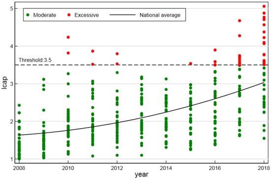Figure 5 presents the degree of land capitalization in all sample cities in the form of scattered points. It shows that the average degree of land capitalization in China is accelerating and approaching the threshold of excessive land capitalization. There were two upsurges in the overcapitalization of land. The first appeared during 2010–2012, which may have been related to the expansion of land supply and loose monetary policy in the context of the financial crisis. The second climax occurred from 2015 to 2018, when the number of cities entering a state of overcapitalization increased rapidly. Because of the slowdown in economic growth in many cities during this period, the development model of land capitalization gradually lost the support of high economic growth. As of 2018, 16 sample cities had entered a state of overcapitalization. According to the development trend, we can predict that this number may increase. These key cities are regional economic growth fulcrums and the components of China’s regional economic framework. If and when these important economic fulcrums are affected by the excessive capitalization of land, the overall national economic framework will be out of balance. This will lead to a recession in the real economy and harm China’s economic growth prospects. Therefore, the current state of risk warrants attention from policymakers.