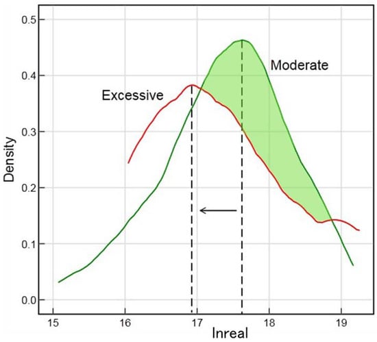 Figure 6 shows the kernel density distribution of real economic output under moderate and excessive land capitalization degrees. When in a moderate state, most observations of real economic output are at a high level. However, when land capitalization changes from moderate to excessive, the probability of high real economic output observations decreases notably. This clearly shows that the excessive development of land capitalization does have a negative impact on the real economy.