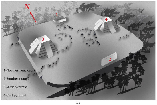 Given the importance of cardinal directions, buildings were oriented to maximize the use of sunlight and natural ventilation and sacred buildings were located in such a way as to be visible to the general public [66]. Since north is believed to be where the ancestors and their wisdom reside, important structures are found in the northern zone that was not only suitable for sustainable habitation but also most visible to the surrounding commoner residences [67]. A good example of this orientation is the Twin Pyramid Complex in Tikal (Figure 2a) where the structures are north-south oriented. Mayan settlements displayed the above-mentioned characteristics to create a built environment with the highest level of harmonized living, interconnectivity of all entities with the environment, and acknowledgment of spirituality in nature.