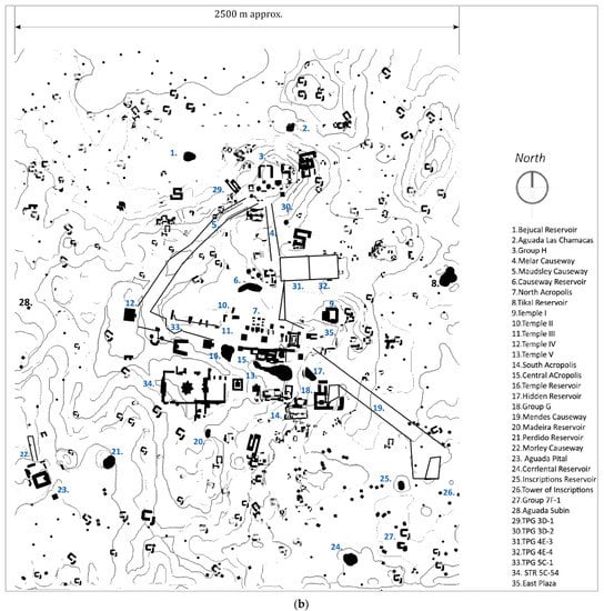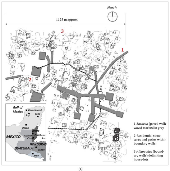 Mayan settlements are famous for their residential clusters, home gardens, ritual and regal centers, and socioeconomic and political activities. Based on this, a city acquired an identity according to its dominant features [56]. It took Maya continuous and intensive procedures of agronomy and landscape treatment to adapt various locations for habitation [44]. As a result, adequate urban characteristics seem to emerge from these habitats such as refined construction, residential clusters [57], home gardens [38,58,59], land-use variation [60], neighborhoods, districts, complex institutions [15,61], market exchanges [62], and developed land and water resource management systems [63]. Often, even small settlements such as Joya de Ceren exhibited the civic and social order found in large settlements [64].