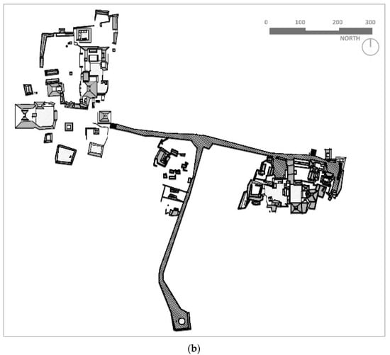 (a) Sacbeob (marked as a colored grey area) in the center of Chunchucmil connecting house-lots (adapted from Hutson et al., 2007 [68] (p. 466)). (b) Sacbeob in Seibal (adapted from Ashmore & Sabloff [69] (p. 209)).
