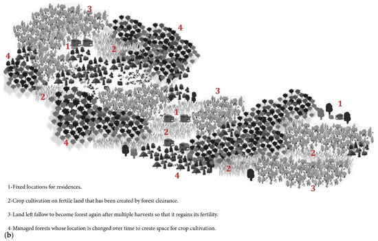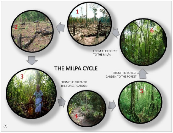 In short, the Milpa cycle is moving from forest to Milpa, followed by Milpa to forest garden, and finally, from forest garden back to the original forest (Figure 7b). Given these ecologically thought-out rotations, the built environment retained what already existed in the form of landscape [90]. Furthermore, diverse interactions with their given locales helped the Maya to spread out risks through house gardens, infields/outfields, Milpa farming, and forest management [90].