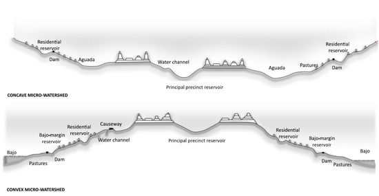 A change from concave micro-watershed (top: Late Pre-Classic Period) to convex micro-watershed (bottom: Late Classic Period) (adapted from Scarborough [101] (p. 140)).