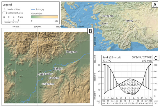 (A) The general setting of the study area in the vicinity of Bergama in western Anatolia (Turkey); (B) a regional overview showing the location of Tekkedere at the transition between the fertile, intensively agriculturally used Bakırçay plain and the Yunt-Dağ mountains; (C) climate diagram of İzmir for the period 1961–1990 (based on Sträer [51], nr. 146).