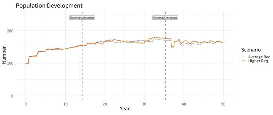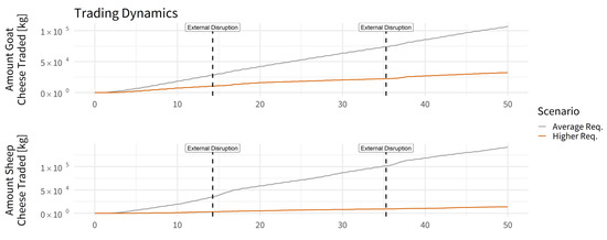 In general, only small differences in the population dynamics of the two scenarios become apparent (Figure 5). The herd dynamics and the population agents’ consumption show marked differences between the dynamics of the modelled scenarios (compare Figures 6–10). In general, the results of both scenarios show stable, but fluctuating dynamics that remain stable even under external disruptions. The consumption patterns of the Average Requirements scenario enable the trade of high amounts of surplus goods. Due to the consumptive behaviour of the Higher Requirements scenario, fewer amounts of goods could be traded during the short periods of high availability (Figure 9).