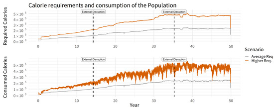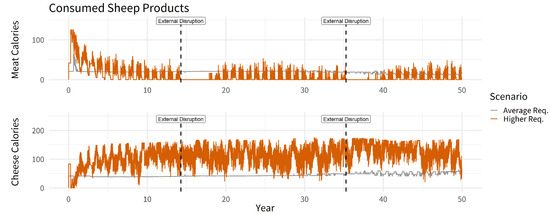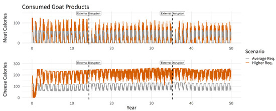 Furthermore, in order to explore the animal husbandry and food production systems’ reaction to pressure, we implemented two abstract external disruptions (in years 14 and 35 of the simulation)—probably caused by cultural, environmental and societal changes [45,97,98]—due to which, c. 30% of the animals are lost for human consumption.