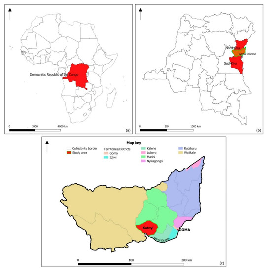 The present research focuses on the Katoyi Collectivity, located in Goma Diocese (GD), North Kivu, Democratic Republic of Congo (DRC). The GD (surface: 26,223 km2) is located in the eastern DRC (DRC, Figure 1a,b). GD is an ecclesiastical administrative unit known as “small north” (“le petit Nord”). It is located in the North Kivu province and a small strip of the Kalehe Territory (Figure 1c) lying in the South Kivu province. Within the Diocese, there are 11 collectivities belonging to five territories (Goma, Rutshuru, Masisi, Walikale, and Kalehe). The study area is characterised by one of Africa’s highest population densities (2,211,000 inhabitants on 26,223 km2 of territory, 88.4 inhabitants/km2). A very high poverty level characterises the local population (72.9% of the population live below the UN poverty threshold in North Kivu, against 71.2% in the whole DRC) [51,52].