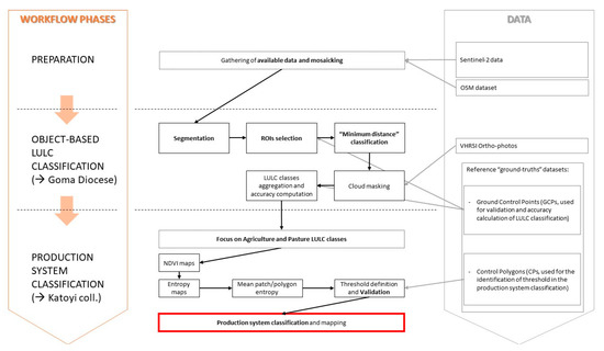 The present research firstly addresses the LULC of the GD in order to map the agricultural and pasture areas, and secondly assesses the existing agricultural production systems (i.e., SOA and BOA) in a strategic collectivity, i.e., Katoyi, in order to support rural development policies and programs. We review the proposed three-phase workflow in Figure 2.